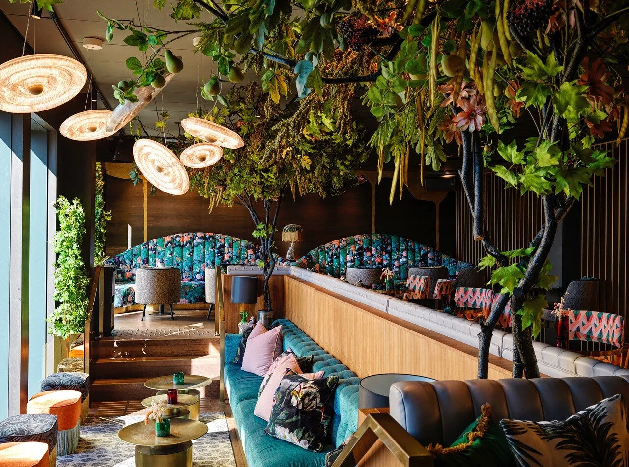 Both restaurant and bar use the botanical theme as inspiration for the interior choices such as wallpapers, fabrics and live plants hanging from the walls.